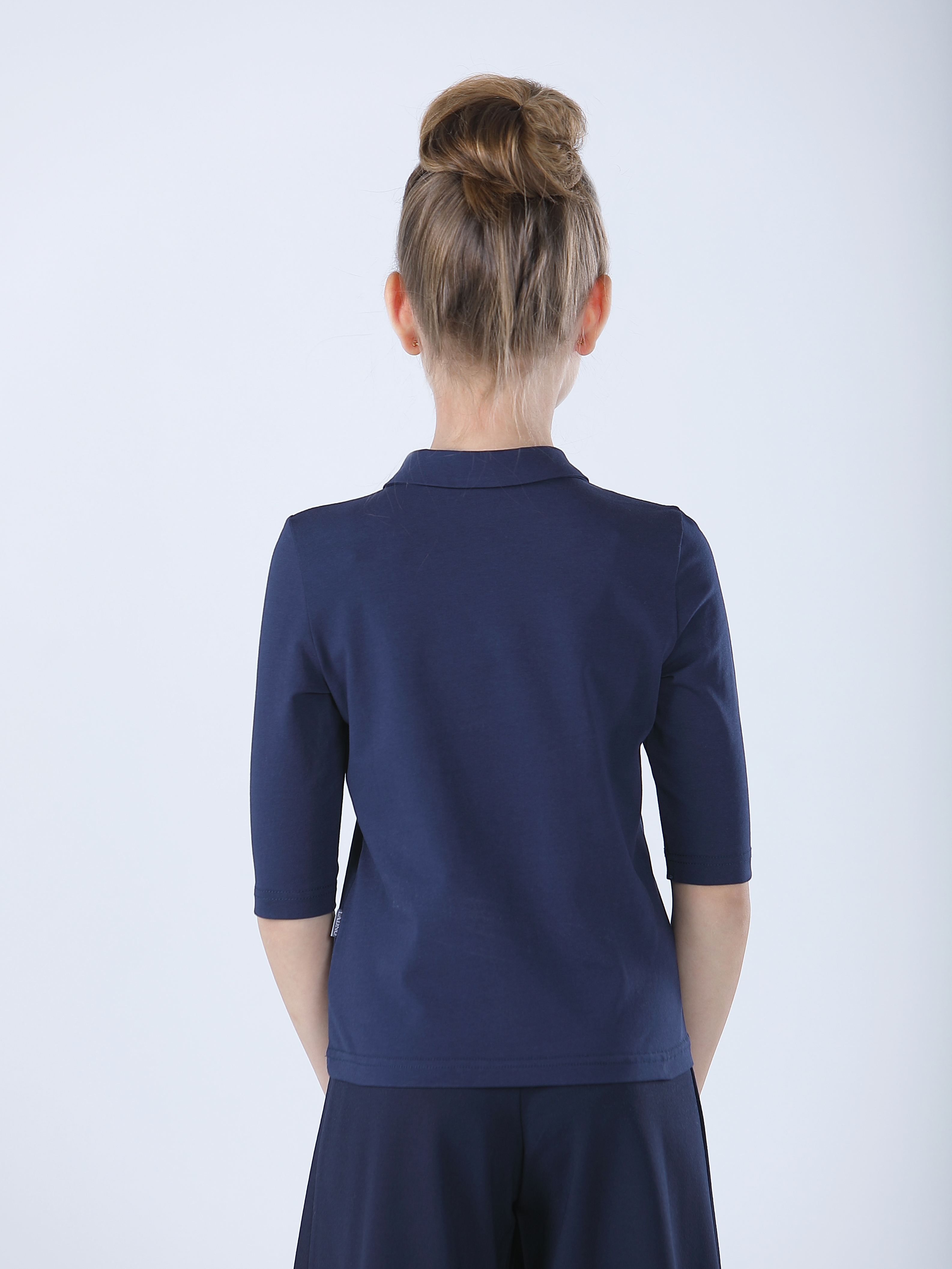 Блузка для девочки с рукавом три четверти и отложным воротничком выполнена из мягкого трикотажа кулирка. Поло в школу для девочки из хлопка с эластаном слегка тянется, приятная на ощупь и позволяет коже дышать, выгодно подчеркивая фигуру.
