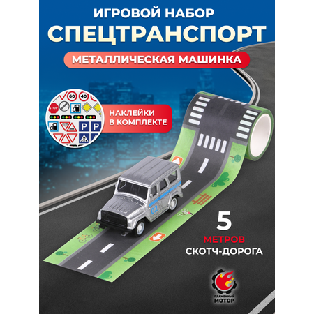 Игровой набор «Спецтранспорт» ТМ «Пламенный мотор» включает в себя реалистично выполненную металлическую полицейскую машину, бумажную скотч-дорогу (длиной 5 метров) и набор стикеров с дорожными знаками.