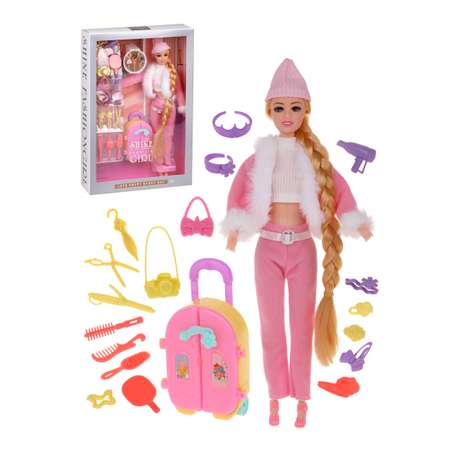 Вместе с игровым набором «Модница» девочка сможет придумать множество вариантов игры, ухаживать за куколкой с помощью входящих в набор аксессуаров и делать ее образ неотразимым. В комплекте прилагаются: куколка и 19 предметов-муляжей (8 инструментов и аксессуаров для создания причесок, 4 украшения, зонт, фотоаппарат, ракетка, сумочка, очки, фен, чемодан).