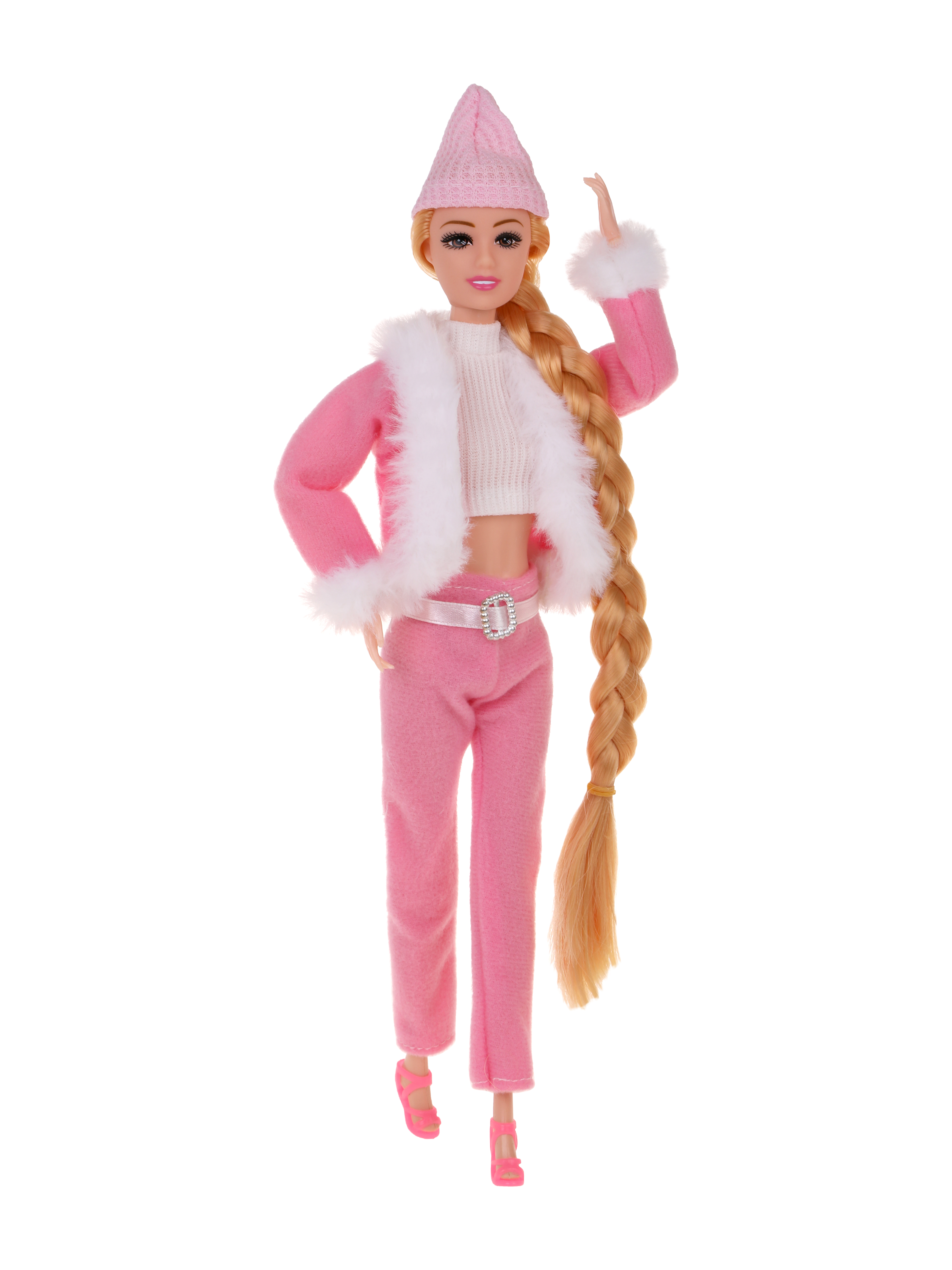 На куколке: белый топ, розовый костюм, шапочка, босоножки. Высота куколки – 29 см. Изготовлено из полимерных материалов с элементами из текстильных материалов.
