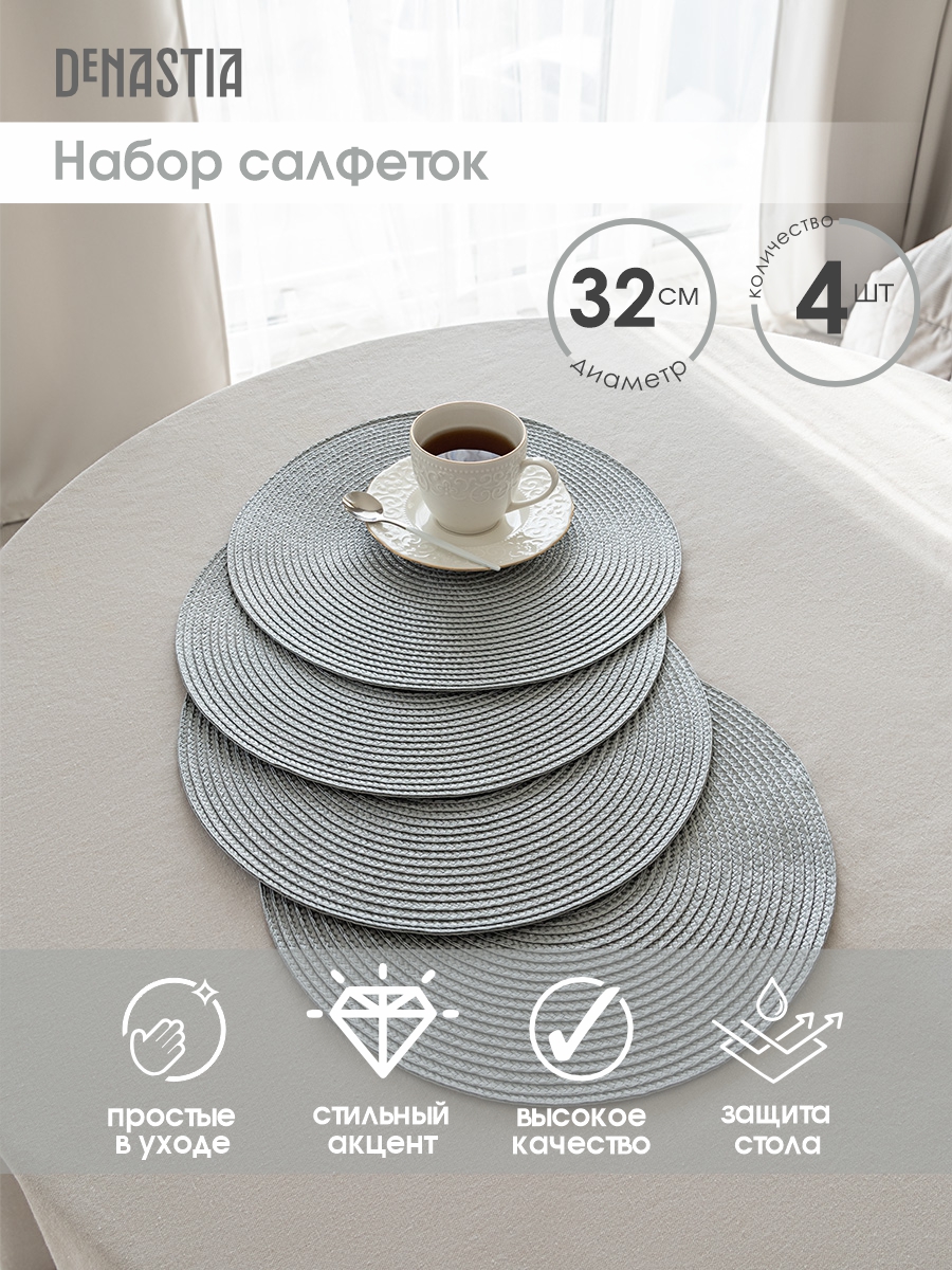 Салфетки сервировочные DeNASTIA плетеные 4 шт D32 см светло-серый