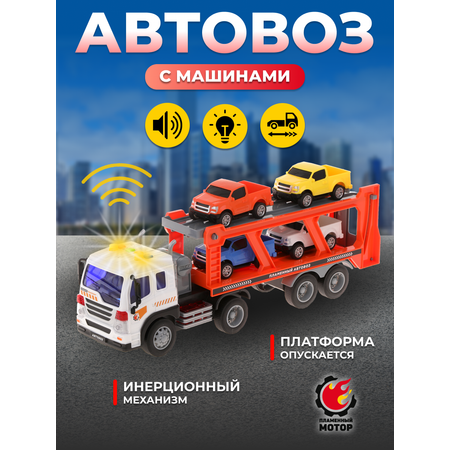 Вместе с автовозом ТМ «Пламенный мотор» у ребенка появится сразу 5 машин: машина-длинномер и 4 пикапа. Платформа автовоза опускается и поднимается вручную для удобства погрузки. При нажатии на кнопки, расположенные на кабине машины, воспроизводятся характерные звуки (звук работы мотора, предупредительный звуковой сигнал, звук погрузки, звук, характерный для реверсивного движения).