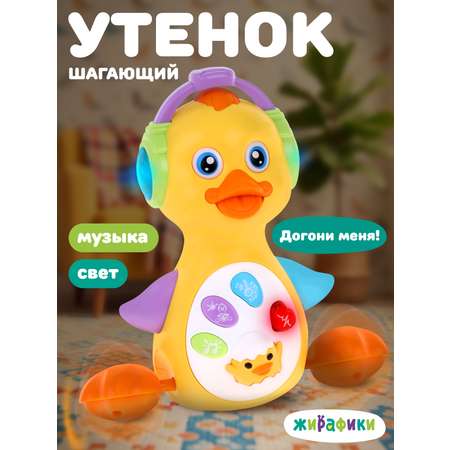 Музыкальная каталка – развивашка на батарейках станет отличным вариантом игрушки, если вы ищете, что подарить мальчику или девочке от года. Милый утенок — интерактивное животное, которое светится и поет, помогая малышам учиться ходить и ползать. Вместе с развивающей игрушкой у малыша появится еще один друг, который умеет воспроизводить звуковые эффекты природы и забавные мелодии. Нажимайте на кнопки, чтобы услышать приятные звуки и музыку, а при нажатии на «сердечко» можно услышать стук сердца.