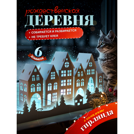 В наборе для рукоделия для детей и взрослых: домики из глянцевой бумаги плотностью 250 гр/м2 (6 шт.), 2 фигурных новогодние декорации с изображением сугробов, уличных фонарей, домов, оленя и других атрибутов зимнего городка, светодиодная гирлянда (гирлянда-роса на батарейках с холодным белым светом), набор наклеек для украшения домиков.