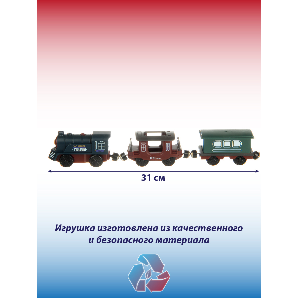 Игрушка поезд имеет функционал. 1. Вагоны и локомотив магнитятся между собой. 2. Локомотив на батарейках со светом и звуком при передвижении кнопки на корпусе едет вперед, носовой фонарь подсвечивается, локомотив заднеприводный. Передвижение кнопки в противоположную сторону, локомотив едет назад. Нажатие на кнопку со значком музыки. Издает звуки гудка, отправляющегося паровоза, железнодорожного переезда. У вагона с балконом поднимается крыша. Вагоны катаются вперед и назад.