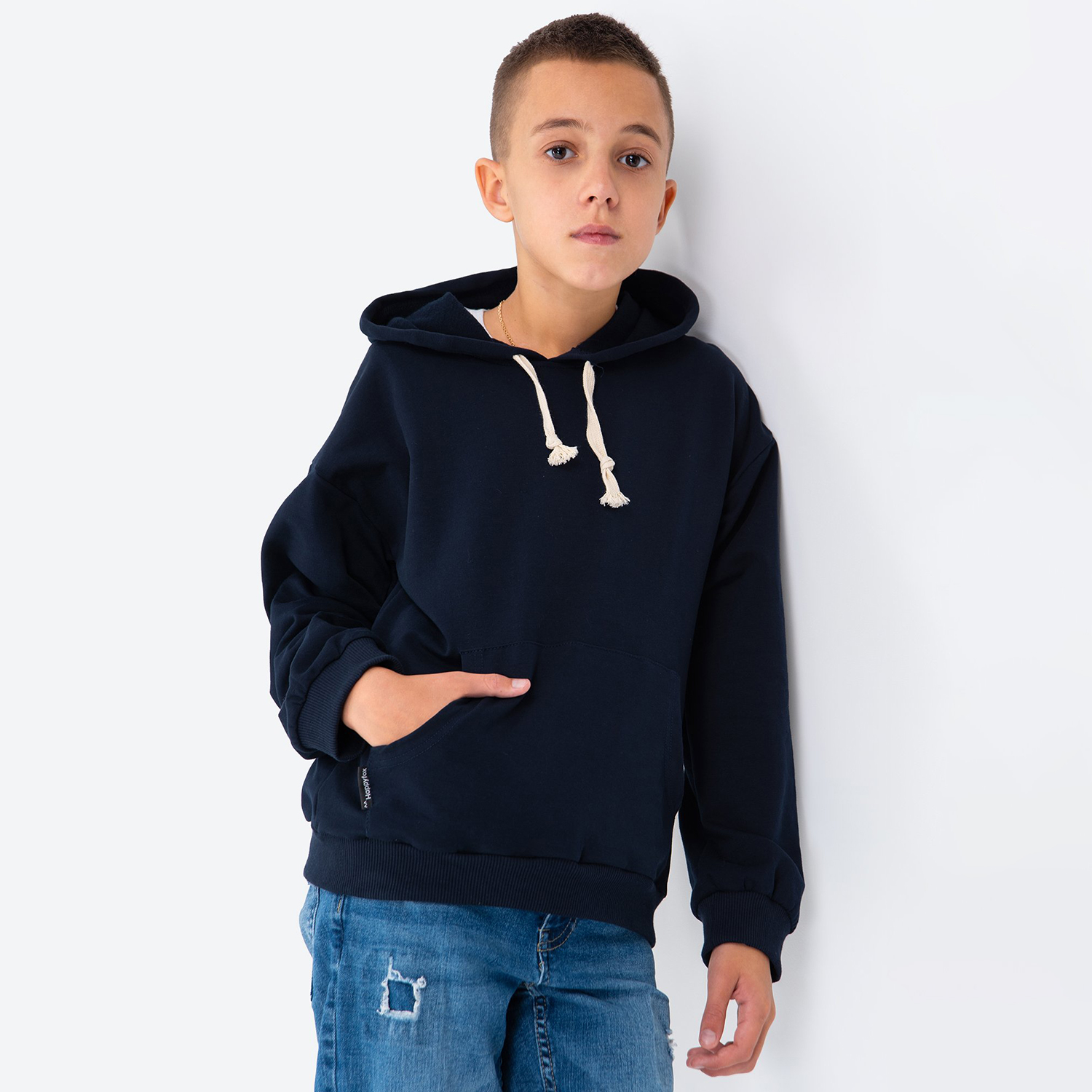 Теплая детская оверсайз толстовка для мальчика и мальчиков-подростков выполнена из плотного футера двухнитки с начесом. Глубокий капюшон с утяжкой и удобный карман кенгуру делают худи не только уютным, но и стильным. Благодаря свободному крою он не сковывает движений и дарит уют в течение всего дня. Однотонная толстовка для детей представлена в темно-синем цвете. Подростковая демисезонная кофта выполнена из натурального 100% хлопка. Благодаря плотной трикотажной ткани худи отлично подходит для морозной зимы, прохладной осенней и весенней погоды. Мягкий начес отлично сохраняет тепло и не пропускает холодный воздух. Хлопковый свитшот ультрамаринового цвета не боится частых стирок и надолго сохраняет первоначальный внешний вид. Прямой крой oversize дарит свободу движений. Удобный капюшон на шнурке защитит от ветра, а карман кенгуру согреет руки в прохладную погоду. Эластичные манжеты не позволяют рукавам задираться, а манжетный пояс удерживает толстовку на месте даже при активных движениях. Утепленный джемпер из трикотажа отлично подходит для весны, осени и зимних дней. Повседневная кофточка сапфирового цвета идеальна для прогулок, отдыха, детского сада, поездок и спорта. В спортивной толстовке цвета индиго удобно заниматься бегом и тренировками на улице. Рост модели 140 см, параметры: объем груди 73, объем талии 65, объем бедер 81 см. На нем толстовка с начесом для мальчика размера 140.