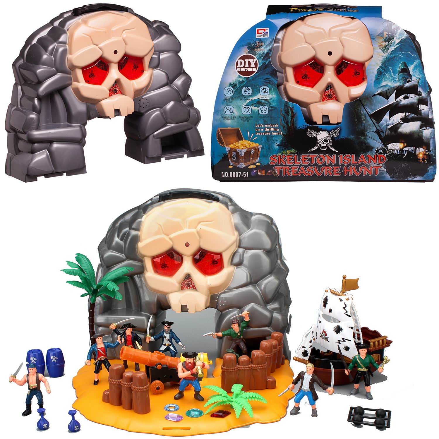 Игровой набор «Остров черепа» от бренда Junfa позволит юным путешественникам отправиться в удивительное морское приключение на настоящем пиратском корабле и оказаться на таинственном острове. Миниатюрные фигурки пиратов, тематические игровые предметы и оригинальное оформление острова сделают игру с набором интересной и увлекательной. После игры все предметы будет удобно хранить внутри коробки-черепа. Комплектность: скала, пляж, ограждение – 3 части, корабль – 3 части, пальма – 4 части, куст – 2 части, пушка, ядро – 4 шт., бочка – 2 шт., мешок, сундук, сокровища (драгоценные камни – 4 шт., мешочки с деньгами – 2 шт.), фигурка пирата – 8 шт. Материал: полимерный материал.Цены в интернет-магазине могут отличаться от розничных магазинов.