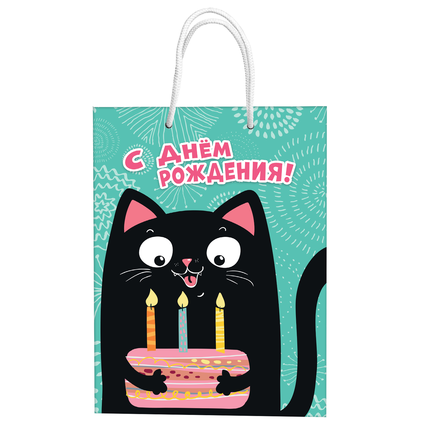 Яркий подарочный пакет с изображением милых кошечек - для упаковки подарков ребенку на день рождения или другой праздник.
