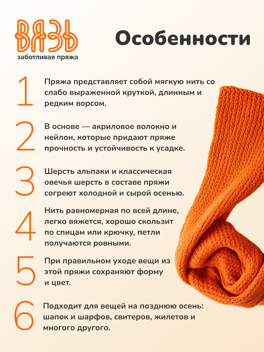 Альпа – отличный выбор для комплектов шапочка и шарф, свитеров или платьев, других изделий на осень или раннюю весну.