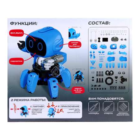 Робот-конструктор «Спок» создан специально для маленького любителя робототехники. Ребёнок самостоятельно соберёт устройство с интеллектуальной системой управления и поиграет им.Особенности роботаВо время игры светятся глаза.Обходит препятствия благодаря инфракрасным сенсорам.Следует за рукой — ребёнок сможет взаимодействовать с роботом и контролировать его движения.Ходит на 6 ногах и оснащён двумя электромоторами для быстрого и плавного движения.Для работы требуется 4 батарейки типоразмера AAA (в комплект не входят).Увлекательно и полезно!Сборка конструктора стимулирует развитие логического мышления, пространственного воображения и моторики рук у детей. А ещё помогает освоить основы робототехники и электроники и делает обучение интересным и увлекательным.Характеристики