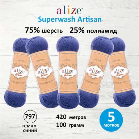 Пряжа ALIZE 'Superwash Artisan' 100гр. 420м. (75% SW шерсть, 25% полиамид), 797 темно-синий. Теплая пряжа 'Superwash Artisan' от ALIZE – тонкая, поэтому вещи получаются не слишком объемными. В составе 25% полиамида, поэтому изделия из этой пряжи практичны, выдерживают частые стирки и прослужат вам не один сезон. Благодаря большому содержанию шерсти (75% ) вещи из пряжи 'Superwash Artisan' отлично согревают в холодную погоду. Теплая яркая пряжа 'Superwash Artisan' отлично подходит для вязания свитеров, шапок и шарфов, носков и уютных домашних тапочек. Пряжа представлена в разнообразной цветовой палитре, на выбор предлагаются различные оттенки и цвета, а также секционные расцветки, которые на готовом полотне формируют аккуратный и равномерный узор. Толщина нити: тонкая. Материал: 75% шерсть, 25% полиамид. Рекомендуемые спицы №2-4, крючок №1-3. Состав: 25% шерсти, 75% акрила. Внимание! Оттенки пряжи могут незначительно отличаться от представленных на фотографиях. Это зависит от партии товара, настроек экрана и освещения.