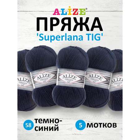 Цена на Пряжа Alize тонкая теплая мягкая Superlana tig шерсть акрил 100 гр 570 м 5 мотков 58 темно-синий - 1072 ₽.