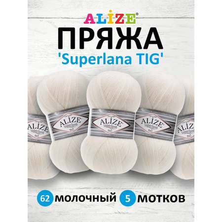 Цена на Пряжа Alize тонкая теплая мягкая Superlana tig шерсть акрил 100 гр 570 м 5 мотков 62 молочный - 1072 ₽.