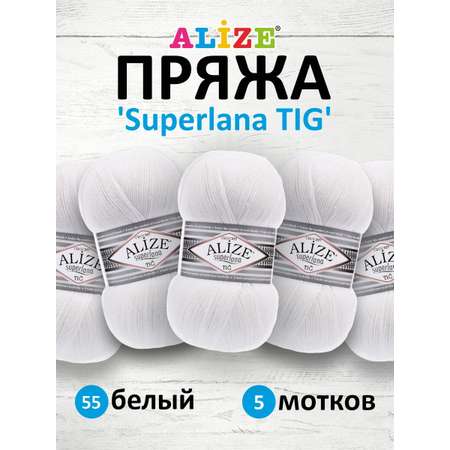 Цена на Пряжа Alize тонкая теплая мягкая Superlana tig шерсть акрил 100 гр 570 м 5 мотков 55 белый - 1072 ₽.