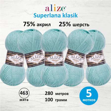 Пряжа Alize теплая для вязания шарфов шапок Superlana klasik 100 гр 280 м 5 мотков 463 мята