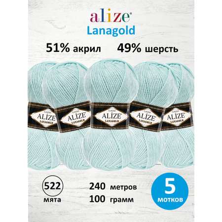 Пряжа Alize полушерстяная мягкая тонкая теплая Lanagold 100 гр 240 м 5 мотков 522 мята