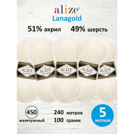 Пряжа Alize полушерстяная мягкая тонкая теплая Lanagold 100 гр 240 м 5 мотков 450 жемчужный