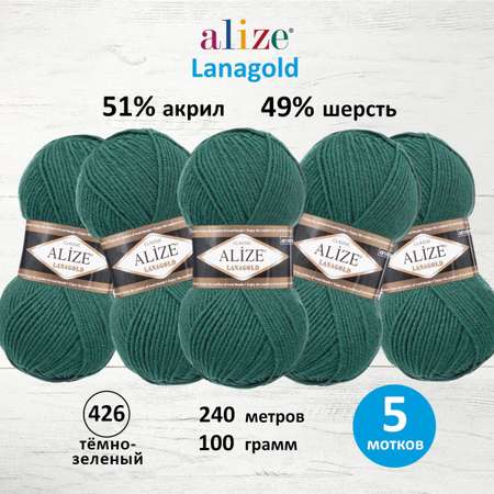 Пряжа Alize полушерстяная мягкая тонкая теплая Lanagold 100 гр 240 м 5 мотков 426 т.-зеленый