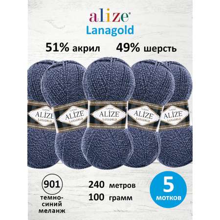 Пряжа Alize полушерстяная мягкая тонкая теплая Lanagold 100г 240м 5 шт 901 т.-синий меланж