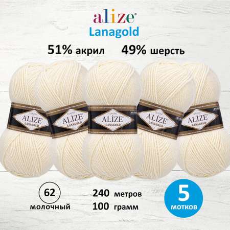 Пряжа Alize полушерстяная мягкая тонкая теплая Lanagold 100 гр 240 м 5 мотков 62 молочный