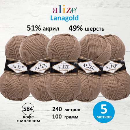 Пряжа Alize полушерстяная мягкая теплая Lanagold 100 г 240 м 5 мотков 584 кофе с молоком