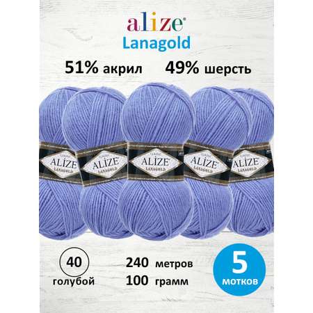 Пряжа Alize полушерстяная мягкая тонкая теплая Lanagold 100 гр 240 м 5 мотков 40 голубой