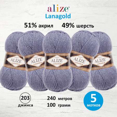 Пряжа Alize полушерстяная мягкая тонкая теплая Lanagold 100 гр 240 м 5 мотков 203 джинса