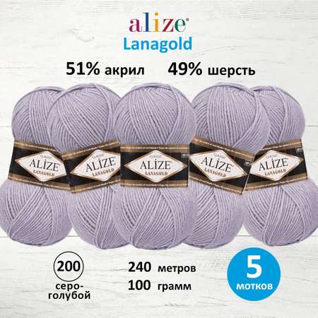Пряжа Alize полушерстяная мягкая тонкая теплая Lanagold 100г 240 м 5 мотков 200 серо-голубой