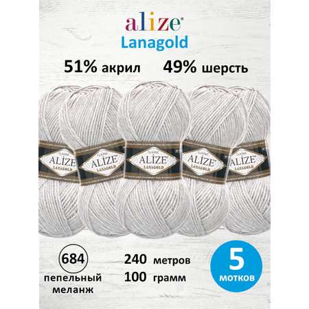 Пряжа Alize полушерстяная мягкая тонкая теплая Lanagold 100г 240м 5 шт 684 пепельный меланж