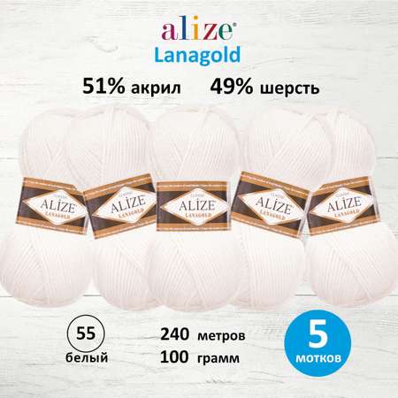 Пряжа Alize полушерстяная мягкая тонкая теплая Lanagold 100 гр 240 м 5 мотков 55 белый