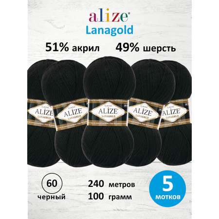 Пряжа Alize полушерстяная мягкая тонкая теплая Lanagold 100 гр 240 м 5 мотков 60 черный