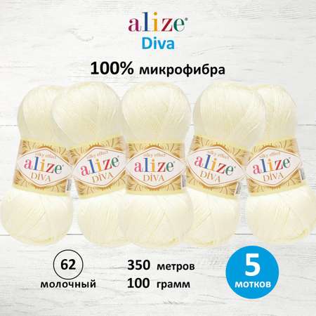 Пряжа Alize для вязания универсальная легкая Diva микрофибра 100г 350 м 5 мотков 62 молочный