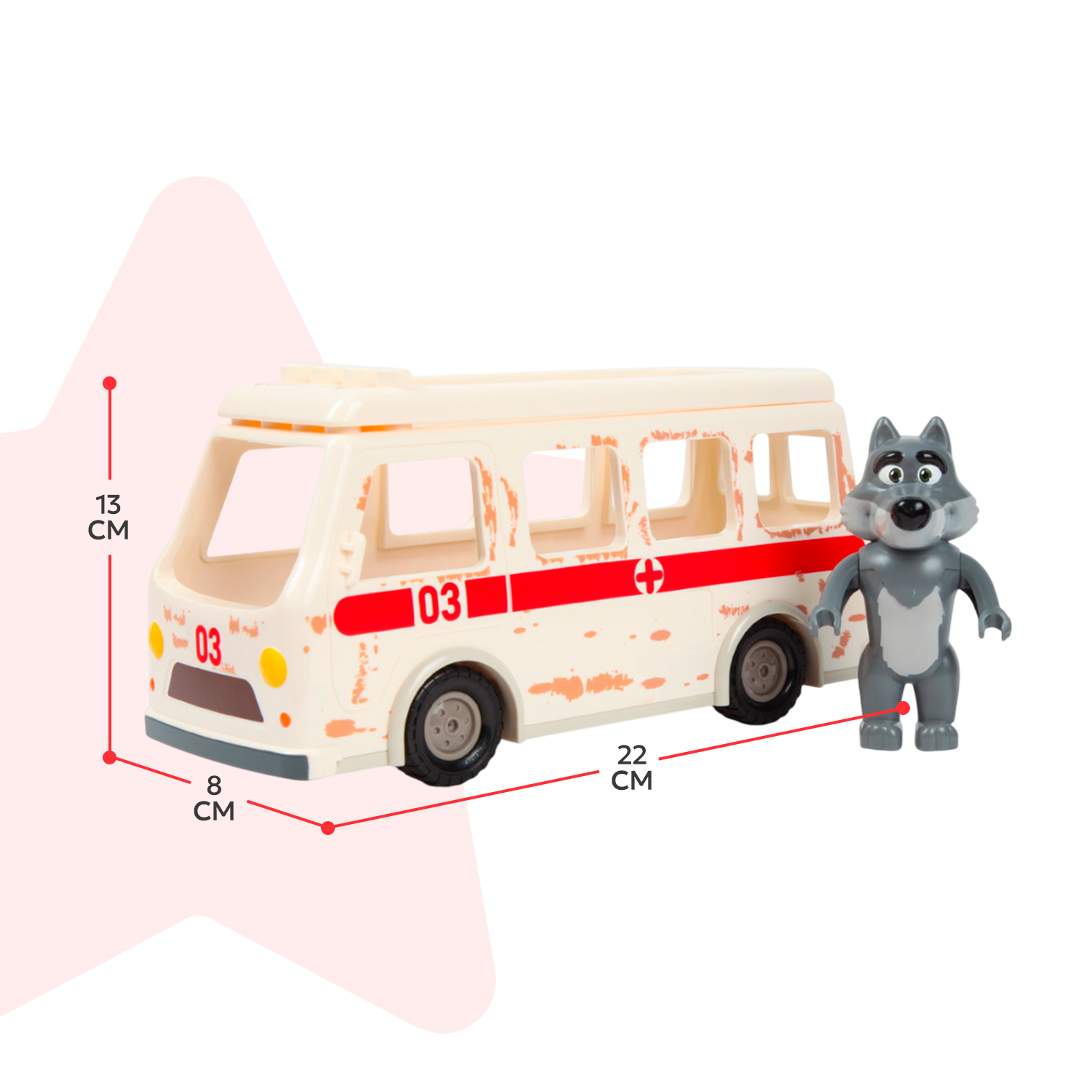 - Взаимодействия минимальные, волки не имеют подвижных ног и голов, только руки. На коробке нарисовано будто волк сидит за рулём, но его даже стоя там не поставить. У скорой нет пазов, чтобы корпус держался за раму, ребенок поднимает игрушку и рама с колесами все время выпадает. Дверь сзади не открывается, мигалка отсутствует. Вообщем что говорить, вроде красиво, но уныло. С Лего сделал сравнение, на фото все понятно. Я бы лучше больше заплатил, но игрушка была бы более проработанной, и тем самым ребенку было с ней интересно играть, а так это шаг назад, после того, что у нас имеется.