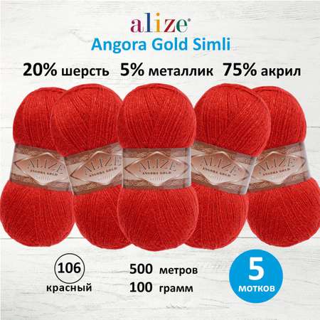 Пряжа Alize для шарфов полушерсть Angora Gold Simli 100 гр 500 м 5 мотков 106 красный