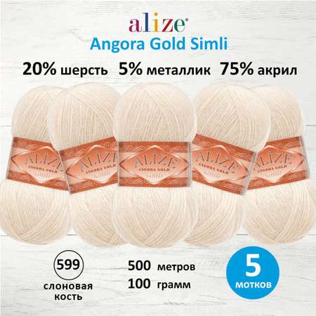 Пряжа Alize полушерсть Angora Gold Simli 100 гр 500 м 5 мотков 599 слоновая кость
