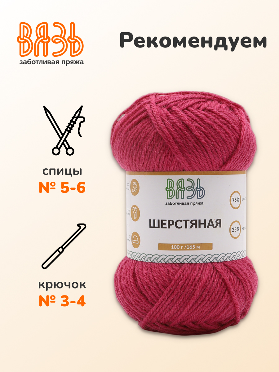 Цена на Пряжа ВЯЗЬ Шерстяная для повседневной одежды 100 гр 165 м 3 мотка 05 малиновый - 502 ₽.