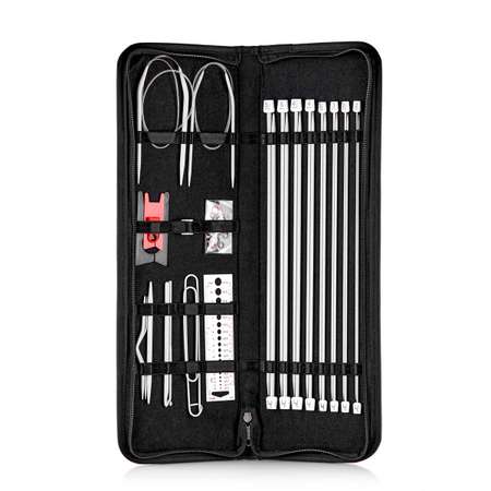 В наборе: алюминиевые спицы (прямые – 8 пар № 2,00-5,50; круговые – 2 пары №4, №6, длина 80 см), крючки для вязания (2 шт., №3,5, №5,5), вспомогательные спицы для создания объемных узоров (3 шт.), бобины для намотки пряжи (2 шт.), линейку для определения размера спиц, маркировочное кольцо и предохранитель для спиц. Все принадлежности упакованы в удобный чехол на молнии.