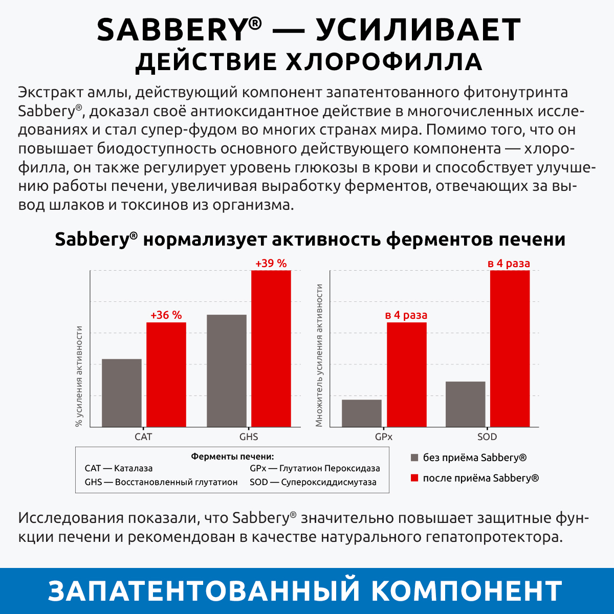Экстракт амлы, действующий компонент запатентованного фитонутриента Sabbery, доказал своё антиоксидантное действие в многочисленных исследованиях и стал супер-фудом во многих странах мира.Помимо того, что он повышает биодоступность основного действующего компонента — хлорофилла, он также регулирует уровень глюкозы в крови и способствует улучшению работы печени, увеличивая выработку ферментов, отвечающих за вывод шлаков и токсинов из организма, поддерживает здоровую микрофлору кишечника.