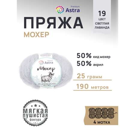 Цена на Пряжа Astra Premium Мохер Mohair полушерстяная с ворсом 25 г 190 м 19 светлая лаванда 4 мотка - 626 ₽.