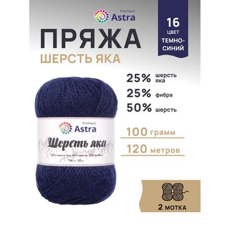 Цена на Пряжа Astra Premium Шерсть яка Yak wool теплая мягкая 100 г 120 м 16 темно-синий 2 мотка - 561 ₽.