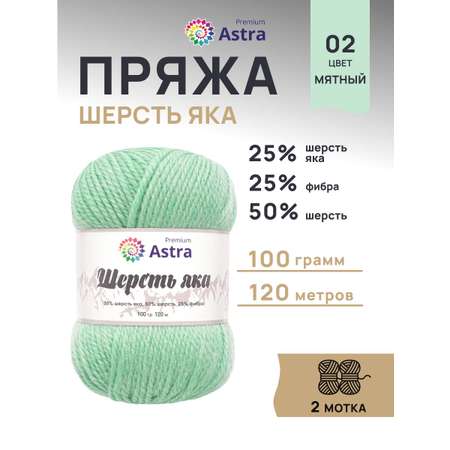 Цена на Пряжа Astra Premium Шерсть яка Yak wool теплая мягкая 100 г 120 м 02 мятный 2 мотка - 563 ₽.