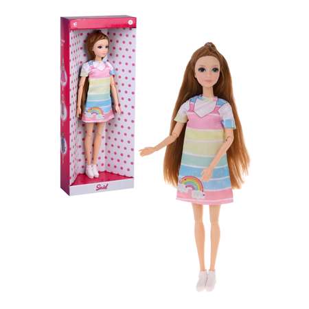 Стильная кукла в современном комплекте одежды. На куколке платье с коротким рукавом и ярким принтом, сникерсы. У куклы длинные шелковистые волосы, шарнирные руки и ноги (всего 6 точек артикуляции). С ней удобно играть, задавая различные положения для игры. Высота игрушки: 29 см. Изделие изготовлено из полимерных материалов с элементами текстильных материалов.
