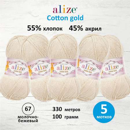 Цена на Пряжа Alize для теплой одежды игрушек Cotton gold 100 гр 330 м 5 мотков 67 молочно-бежевый - 923 ₽.