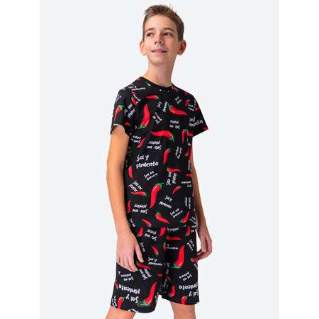 Черный костюм с рисунком перцы подходит для сна и отдыха. Подростковый трикотажный костюм идеален для дома.