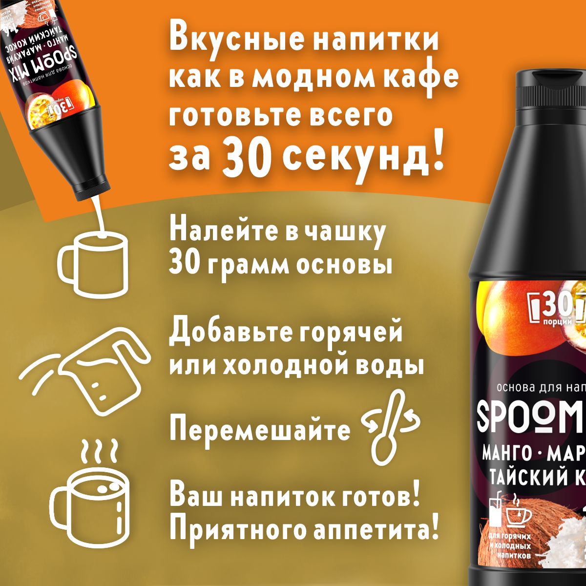 Уважаемые покупатели! Обращаем Ваше внимание на то, что возможны два варианта крышек, в зависимости от наличия на складе.SPOOM MIX — идеальная основа для приготовления ароматного чая, коктейлей, смузи, лимонадов и многого другого. Основой можно заменить любой сироп для коктейлей, а напиток получится более насыщенный за счет фруктовой части в составе. Также SPOOM MIX отлично подходит для добавления в мороженое, творог, каши, в качестве ингредиента для пирожных, муссов, зефира, мармелада. Основа как концентрат сока имеет насыщенный вкус и аромат. Разбавьте основу SPOOM MIX обычным кипятком и чай готов. Можно использовать заваренный горячий зелёный или чёрный чай. Смешайте SPOOM MIX с газированной или простой водой. Желаете придать напитку приятную терпкость «айс ти»? Добавляйте вместо воды остуженный заваренный чай. Если особенно жарко, кубики льда совсем не будут лишними. Основы для напитков SPOOM MIX позволяют экономить время на приготовлении, обеспечивая разнообразие вкусовых решений.