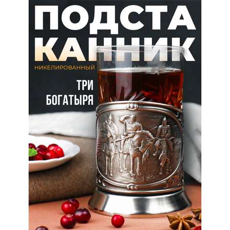 Представляем вам уникальный подарок, погружающий в атмосферу древней Руси и русской культуры — подстаканник "Три богатыря" с хрустальным стаканом.