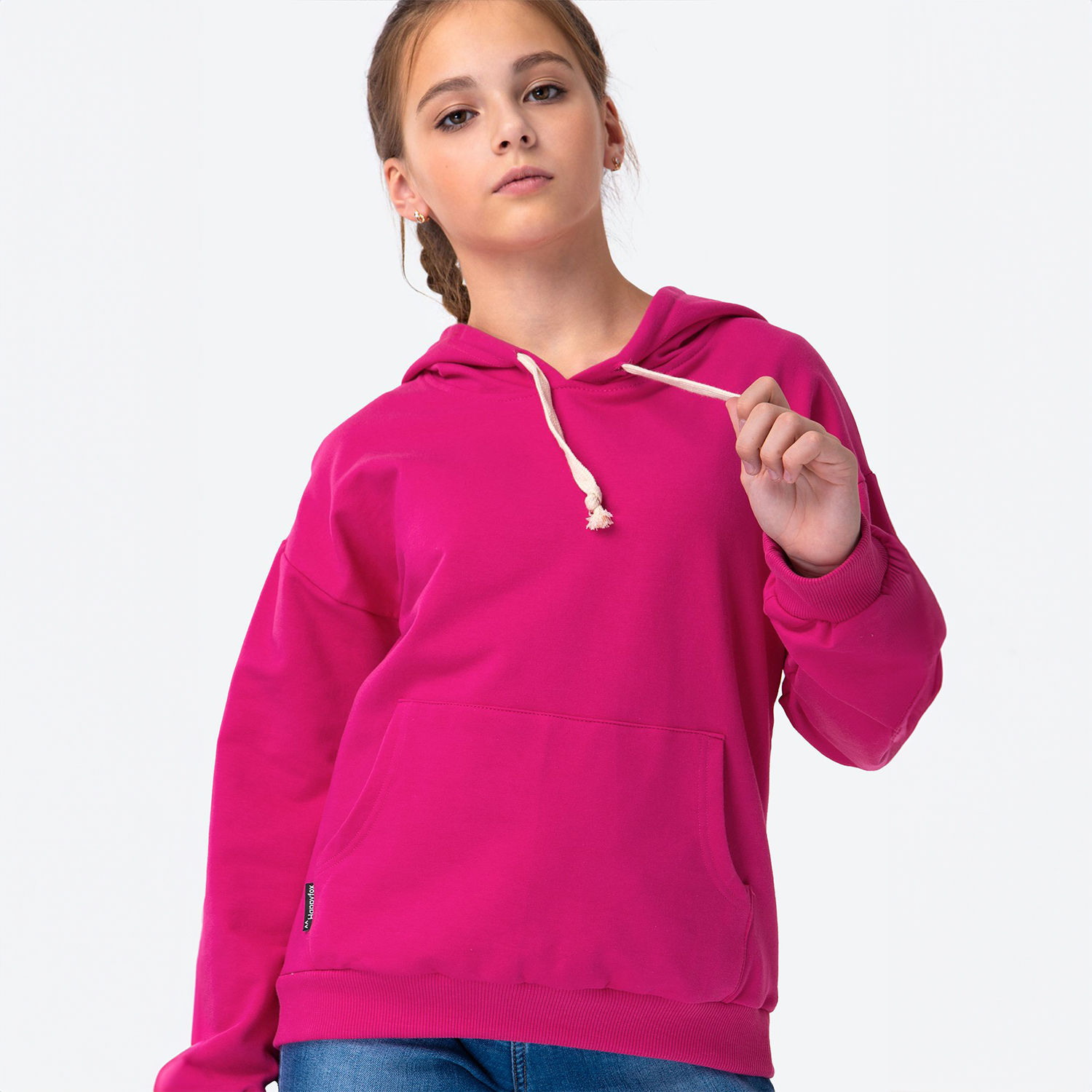 Теплая детская оверсайз толстовка для девочки и девочек-подростков выполнена из плотного футера двухнитки с начесом. Глубокий капюшон с утяжкой и удобный карман кенгуру делают худи не только уютным, но и стильным. Благодаря свободному крою оно не сковывает движений и дарит уют в течение всего дня. Однотонная толстовка для детей представлена в цвете фуксия. Подростковая демисезонная кофта выполнена из натурального 100% хлопка. Благодаря плотной трикотажной ткани худи отлично подходит для морозной зимы, прохладной осенней и весенней погоды. Мягкий начес отлично сохраняет тепло и не пропускает холодный воздух. Розовый хлопковый свитшот не боится частых стирок и надолго сохраняет первоначальный внешний вид. Прямой крой oversize дарит свободу движений. Удобный капюшон на шнурке защитит от ветра, а карман кенгуру согреет руки в прохладную погоду. Эластичные манжеты не позволяют рукавам задираться, а манжетный пояс удерживает малиновую толстовку на месте даже при активных движениях. Утепленный джемпер из трикотажа сливового цвета отлично подходит для весны, осени и зимних дней. Повседневная кофточка идеальна для прогулок, отдыха, детского сада, поездок и спорта. В спортивной толстовке удобно заниматься бегом и тренировками на улице. Рост модели 152 см, параметры: объем груди 76, объем талии 63, объем бедер 81 см. На ней размер 152.
