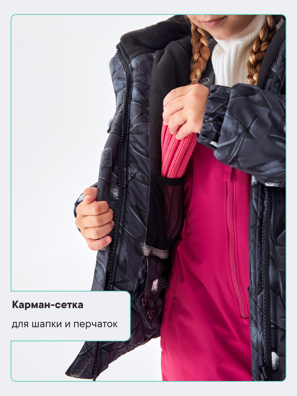 - Манжеты: эластичные и внутренние с прорезью для пальца защищают от ветра и снега