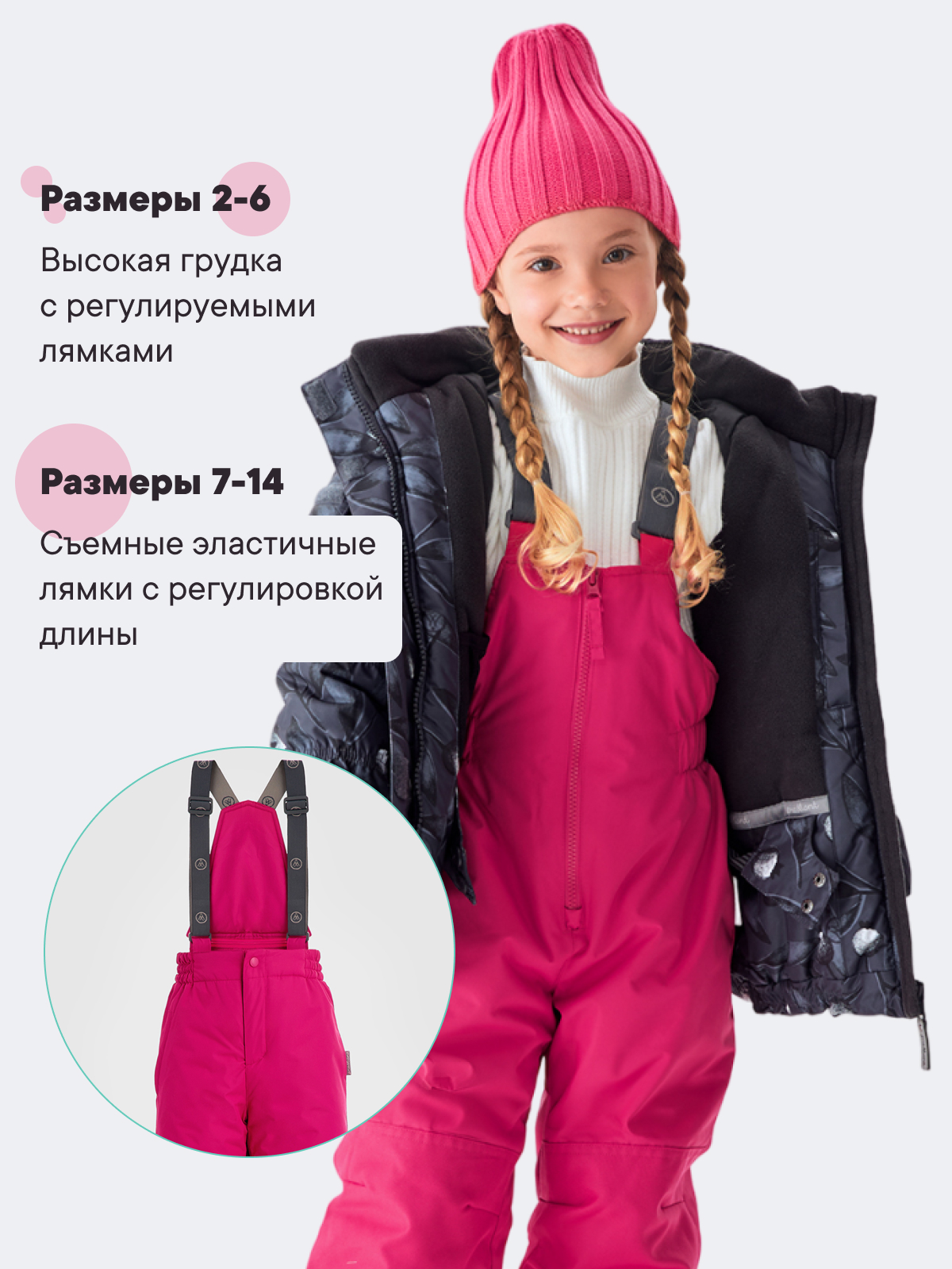 - Брюки: до 6 размера - полукомбинезон, от 7 размера - штаны со съемными регулируемыми лямками и съемной спинкой на молнии