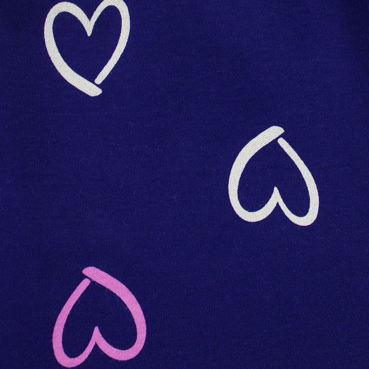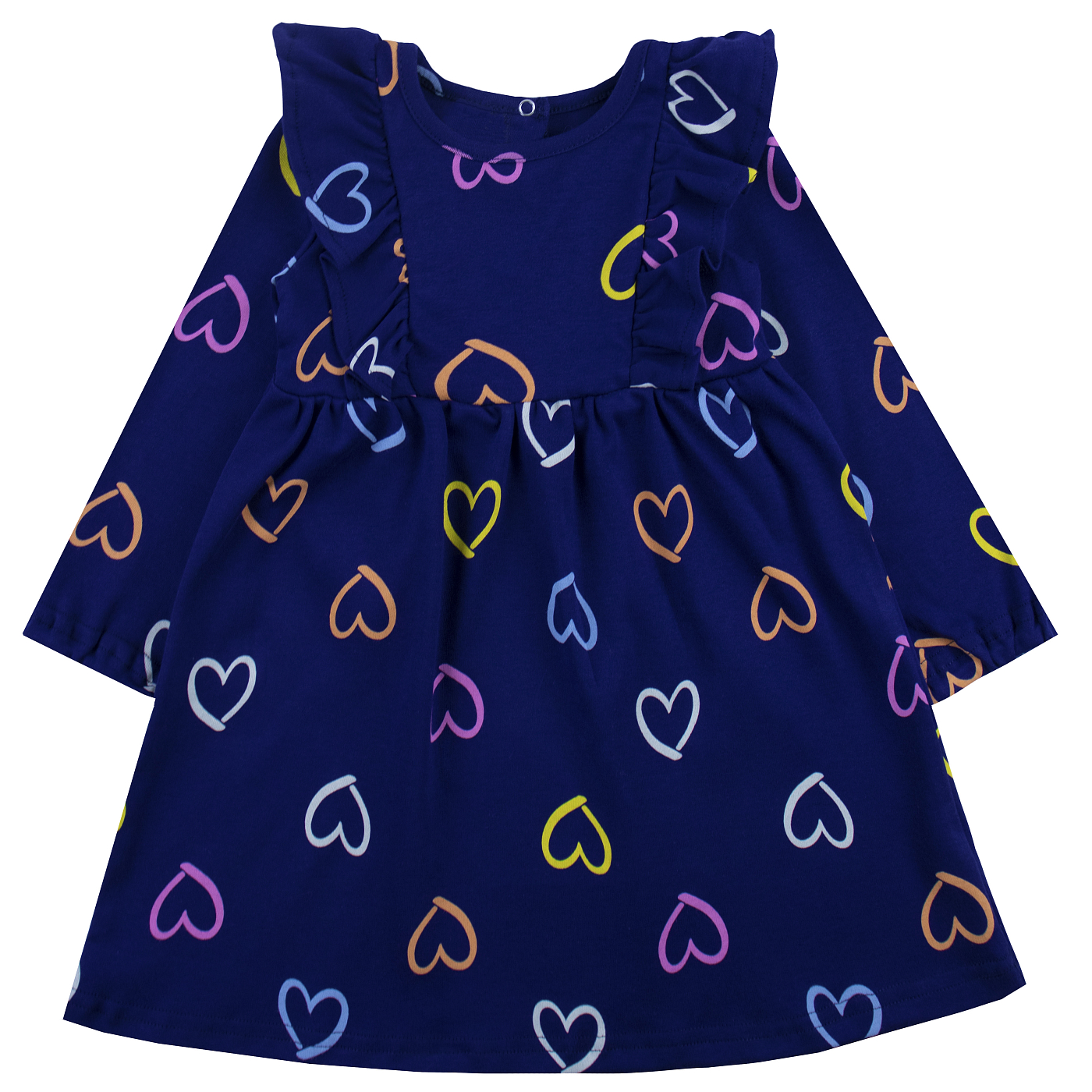 Платье с длинными рукавами для девочки синего цвета с рисунком сердечки. Изготовлено из ткани интерлок 100% хлопок. Платье отрезное ниже линии талии.